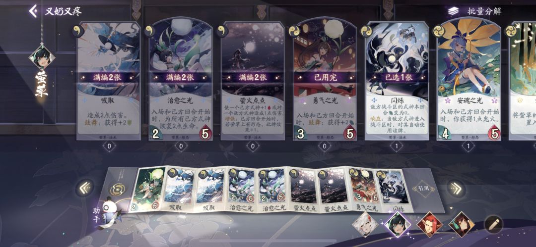 治愈之光:满编。一勾形态,瞬发过牌,入场回复所有式神两点生命,之后每回合回复,是萤草唯一的治疗手段,可以有效配合己方式神站场。