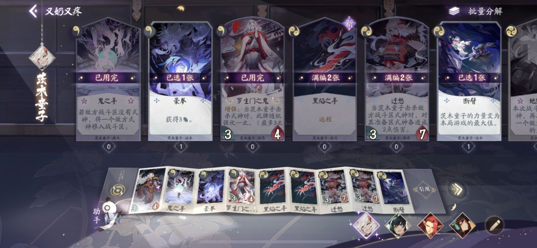 可替代卡牌:如果觉得卡组拖到中后期作战能力仍有不足,可以将断臂换成茨木的觉醒牌。保证茨木后期的稳定高额攻击力,缺点自然是容易导致前期摸到卡手。
