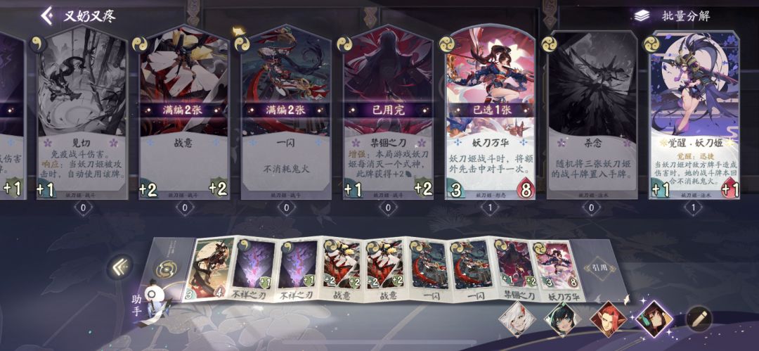 妖刀万华:三勾形态。可以让妖刀额外击中对手一次。值得一提的是,额外的先攻次数妖刀姬是不受伤害的,如果先攻击杀相当于白嫖一个式神。后期可以作为终结技存在,给妖刀提供近乎双倍的战斗力。八点的血量也能保证妖刀后期的站场生存能力。但毕竟三勾过于后期,所以带一张足够。