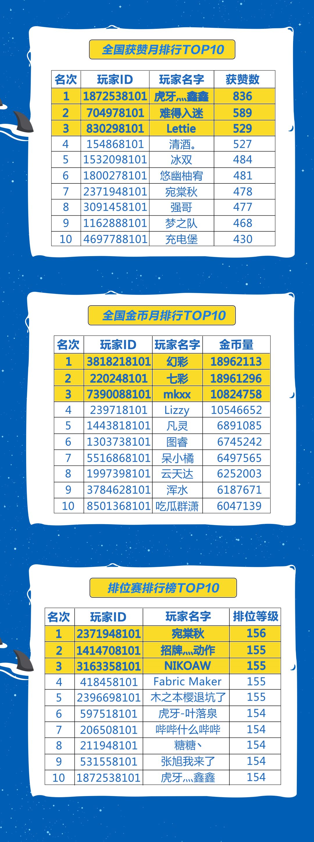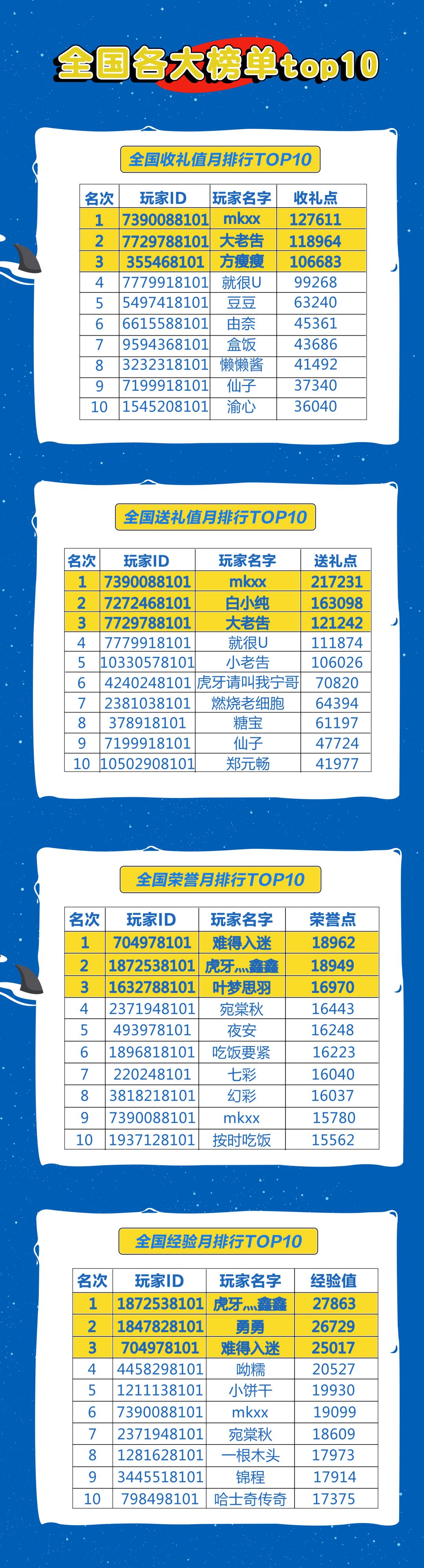 让我们来看看三月份游戏内各排行榜的数据膜拜一下大佬们吧!