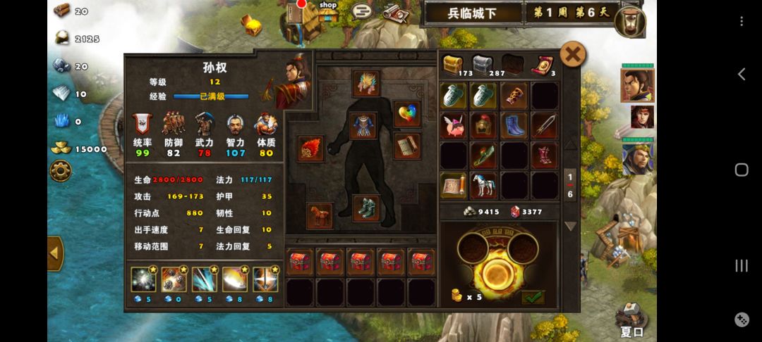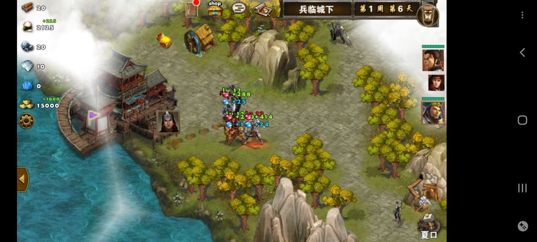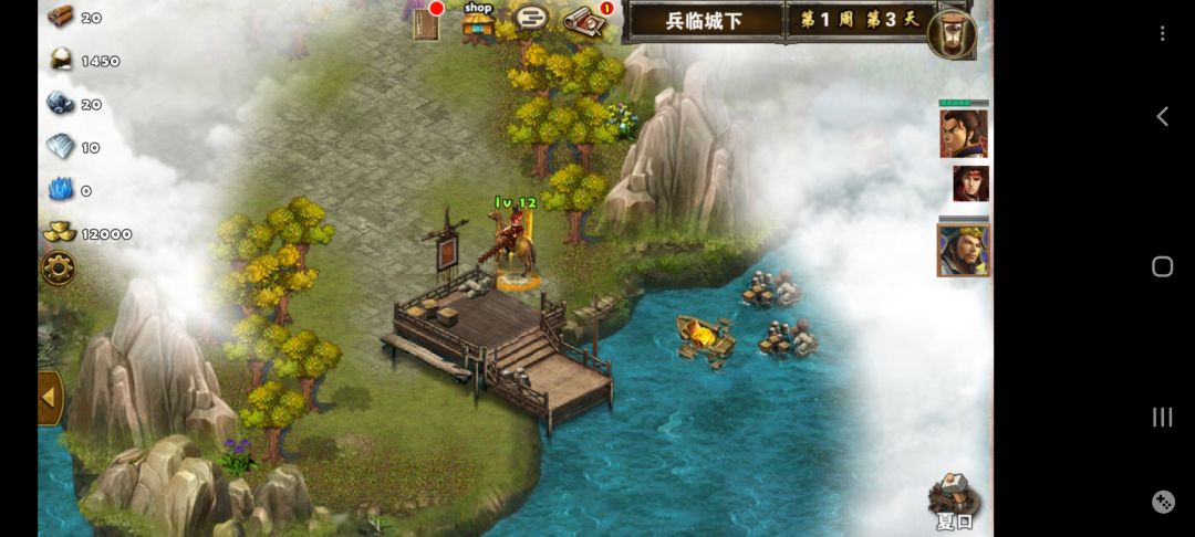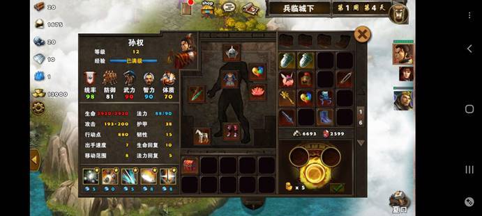 接下来介绍打法,第一天孙权选择诸葛亮加入队伍,直接下河,找周瑜(第一天或第二天能对话到),身上兵解散。诸葛亮分出队伍后,直接找旁边的鲁肃对话,孙权收了周瑜,往下走,清理拦路的小将,小将很容易杀。这个装备的诸葛亮打毛玠很容易,一回合火扇烧下面的小兵,二回合卧龙光线晕主,然后有技能用技能就行了,就算诸葛亮不带五色石也轻松过。(五色石给后面BOSS战做准备)如果对自己装备不是很有信心,建议诸葛亮打完毛玠回来把右上角的乌龟清了,拿完奇袭技能再和孙权一起上岸。如果豪华装备可以直接第三天就让孙权上岸,此时岸上会有一个鹰卫模型的人是可以躲掉的(天数和孙权诸葛亮站位,参见下图),孙权第三天打完堵路的敌将然后上岸不动,诸葛亮第四天打完毛玠后坐船来到码头前,不上岸。如图所示: 这里需要看BOSS蔡瑁的兵是什么,如果是凤凰、鹰卫这些很难打,光靠孙权周瑜两人推容易翻车,所以建议把诸葛亮先调过来去垫刀,消耗BOSS的兵,再用孙权周瑜去打,因为这关孙权是不能阵亡的。孙权的山贼不要解散,如果碰到难搞的兵比如凤凰鹰卫散仙水兵,升级丹阳,然后分队,去当活靶子给两个英雄抗伤害。当然还有种路线是诸葛亮吃奇袭双动,配合五色石,一个人能单挑BOSS,有小概率翻车,但是多一场战斗,取舍看个人吧,反正刷起来时间差不多,孙权周瑜怎么快也要8-9回合。哎,两个人都不如诸葛亮暴力,这游戏的平衡性也是没谁了,周瑜毕竟还是竞技场的武将,刷图中庸的一匹,打辅助还行。