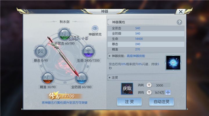升级离山剑宗的神器可以提供多方面属性,包括全攻击、全防御、生命值、暴击和精准。装备神器还会附带自己的神器技能,离山剑的高级神器技能可以在受到攻击后有10%的概率提升8%闪避,持续五秒,这个神器效果会随着神器的升级不断提升,闪避属性对于离山剑宗这类角色来说是非常重要的。