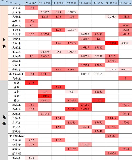 中册记录了血梅谷、大梦泽、虎啸谷、酆都、五毒林、尸冢、修罗场、九龙山等地灵植灵材的分布情况。图中颜色越红说明爆率越高,图中数值为单次神游所得收益的参考期望。混元道果与空冥石万界情况相仿,故此图中不再展示。