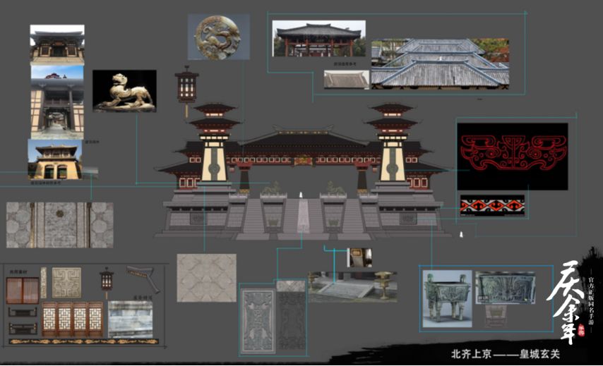 北齐的皇城,在原著的设定中,是一个旧的都城,曾经也风光过,而今被南庆超越。因此,北齐皇宫的设计向汉代长安的未央宫统一。汉代以玄为贵,北齐宫殿铺设黑瓦,整体配色简洁,屋顶舒展平远,门窗图案明朗大气,给人庄重、大方的印象,但尚未到庆国京都的华美而富有活力。