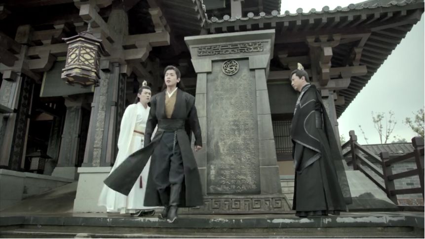以范闲监察院前查看石碑文字的经典镜头为例。唐代建筑常使用红柱白墙,立柱形状则较多样,起初策划选用的圆形,后根据剧中设定,统一改成方形。为强化汉唐风建筑风格,也特意加大了建筑顶面斗拱,出檐进一步深远。
