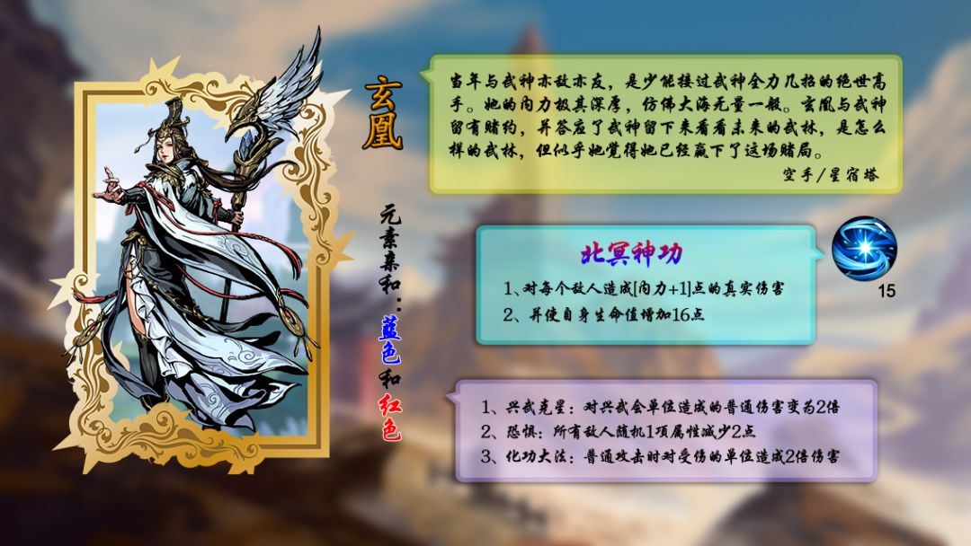 玄凰当年与武神亦敌亦友,是少能接过武神全力几招的绝世高手。她的内力极其深厚,仿佛大海无量一般。玄凰与武神留有赌约,并答应了武神留下来看看未来的武林,是怎么样的武林,但似乎她觉得她已经赢下了这场赌局。(内力深厚这点不禁让小编怀疑她跟我无涯大帅哥有关系~)