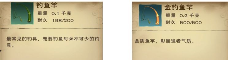 鱼竿分为普通的鱼竿和金鱼竿(50级可制作)。掉率方面并没有多大的区别,但是金鱼竿的耐久度有500,普通鱼竿只有200,金鱼竿比较适合长时间钓鱼。