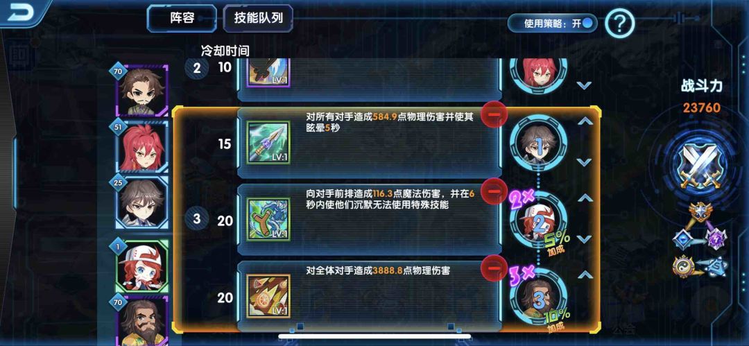 二、独创的个性化技能队列功能:自定义英雄技能释放顺序,建立连携组合。游戏支持自动战斗功能,但是有别于市场上其他游戏所使用的依照技能冷却时间来释放技能的自动战斗顺序;玩家可以在技能队列中自己设置英雄技能释放顺序,并且创建技能连携组合。技能组合一旦设置好,战斗开始后将“自动”功能打开,英雄便会按玩家建立的技能队列顺序依次逐个释放技能,十分便利省时。