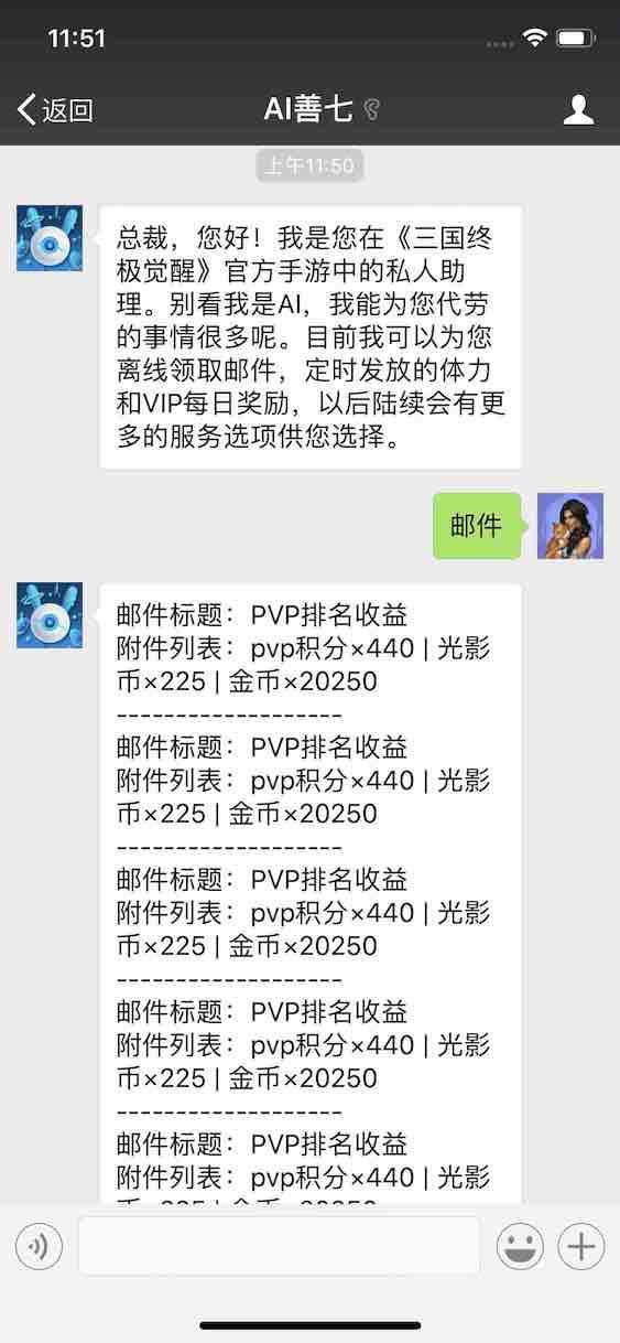 三、独创的微信AI服务:私人助理AI善七可帮助用户线下领取奖励邮件。 用户在关注《三国终极觉醒》官方微信公众号 “AI善七” 后,就可以使用游戏中的“AI善七” 线下处理游戏中的各种事项。目前支持的功能有:领取邮件,体力和VIP奖励,更多功能还在开发中。