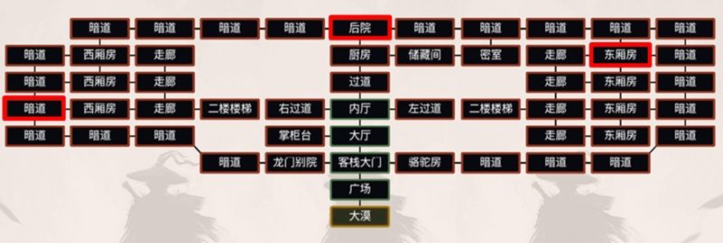 进入地图后一直往上走到达大厅,对话客栈小二三次,过招一次,再次对话二次,要求巡逻客栈,击杀盗贼。盗贼一共有三个,第一个在地图右侧由上往下数的第一个东厢房,第二个在后院(大厅一直往上走),第三个在地图左侧由上往下数的第三个暗道,见图。击杀全部盗贼后,返回大厅并往左,到达掌柜台。对话龙门掌柜,接着过招(掌柜血6000左右,可反复过招),胜利后再次对话任务完成。