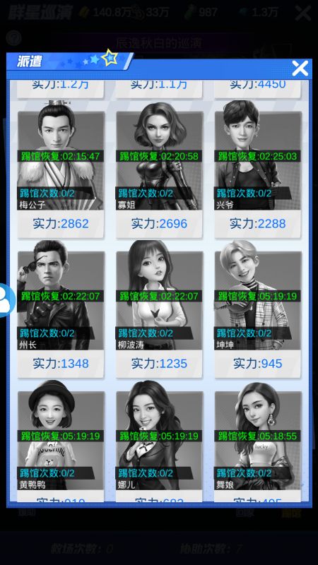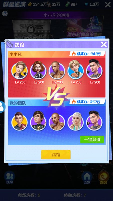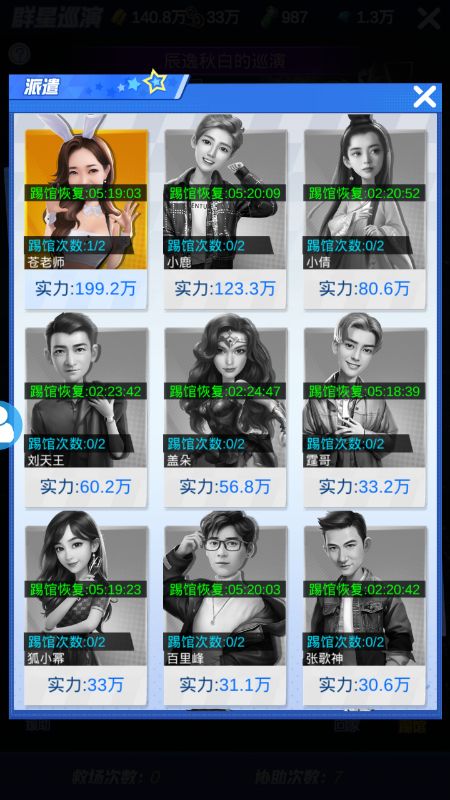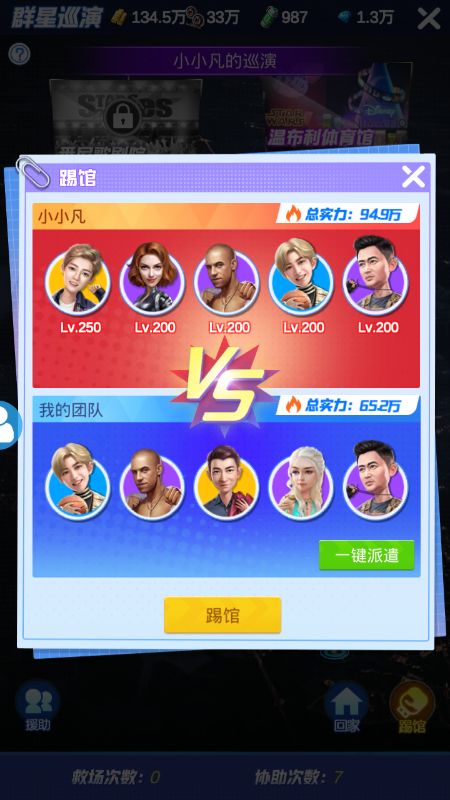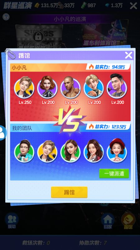 踢馆一次需要5人,因此艺人的板凳程度很重要,同时为使效率最大化,在确保队伍实力大于对手20%的基础(避免意外翻车)上要强弱搭配。