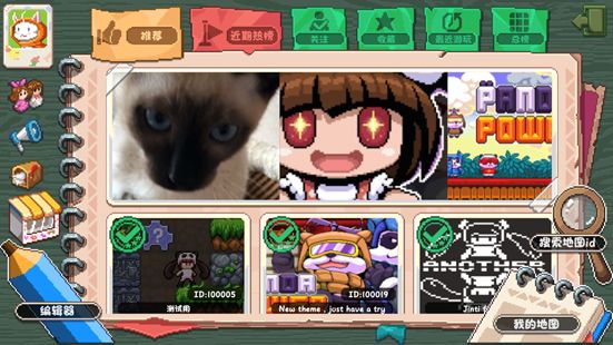 主界面,玩家可以在这里看到并畅玩来自全球各地其他玩家制作的关卡,我们会根据一定算法规则选择一些放到推荐页中进行推荐,让玩家制作的优质关卡能够被更多的人玩到。