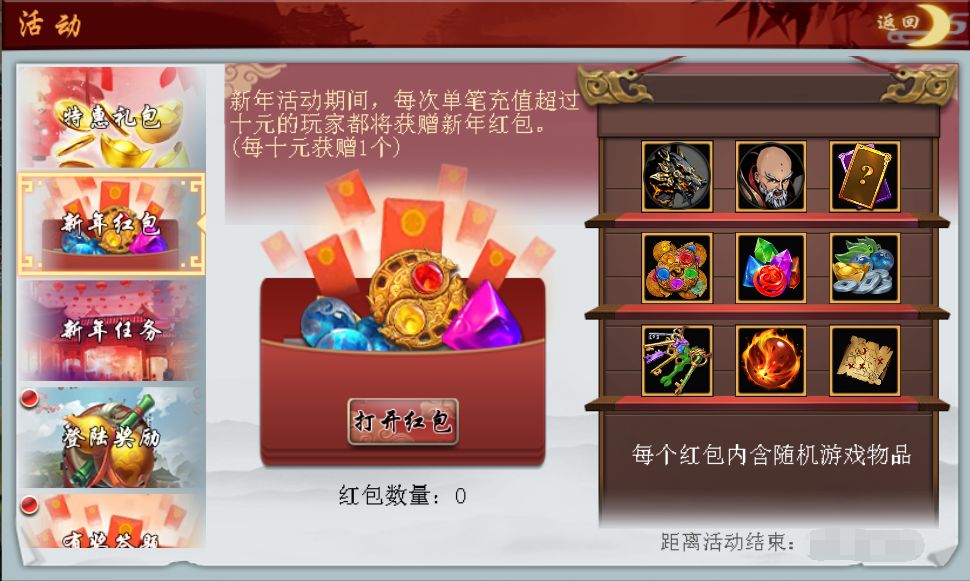 新年活动期间,玩家充值都将额外获赠新年红包。(要单笔超过10元才赠送红包哦~)