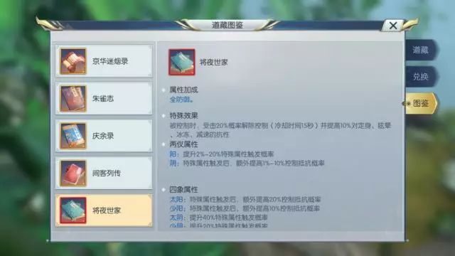 庆余录、间客列传能在攻击、命中目标时带来更多增益,也适合离宫携带。 作为有治疗、增益的辅助,离宫绝对是PK时首先被敌方集火的目标!所以落落要重点推荐一下新道藏“将夜世家”,它有几率解除控制状态,能帮助奶爸摆脱致命的控制!