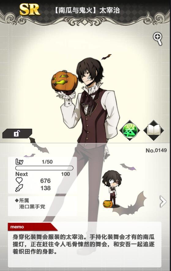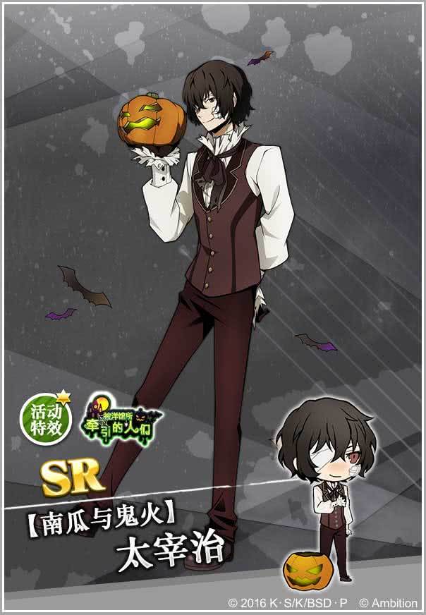身穿化装舞会服装的太宰治。手持化装舞会才有的南瓜提灯,正在赶往令人毛骨悚然的舞会,和安吾一起追逐着织田作的身影。