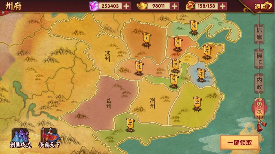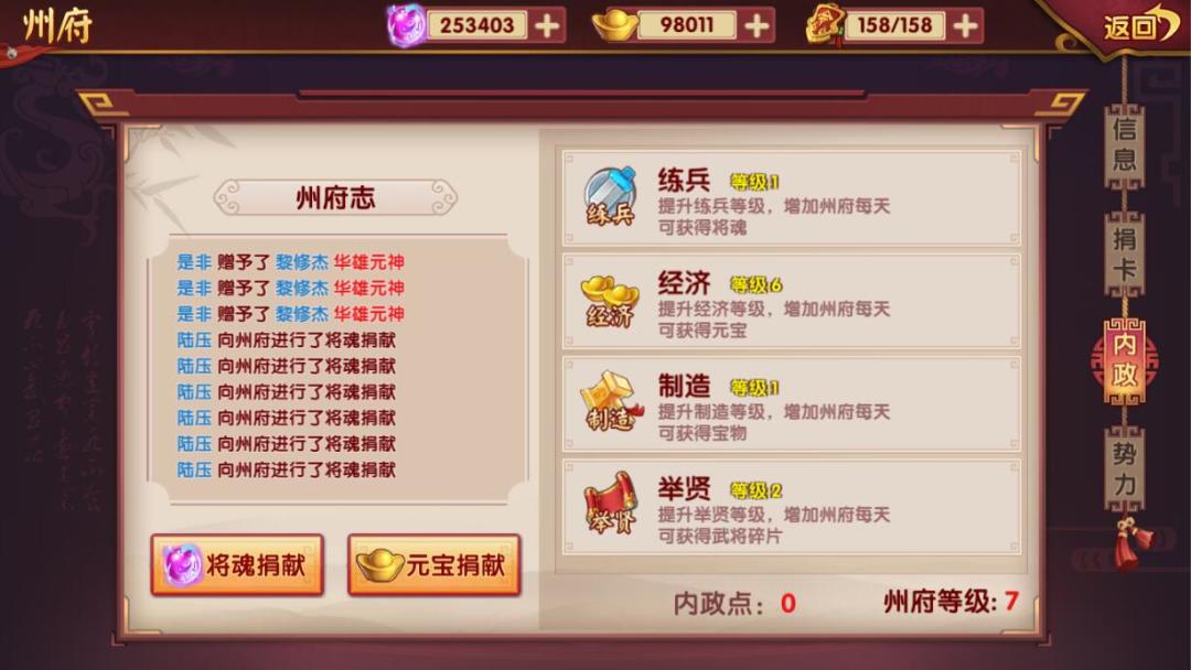 州府内每天可以申请其他成员给自己捐献武将卡,亦可以捐给其他人武将碎片。助力你早日拿到心仪武将