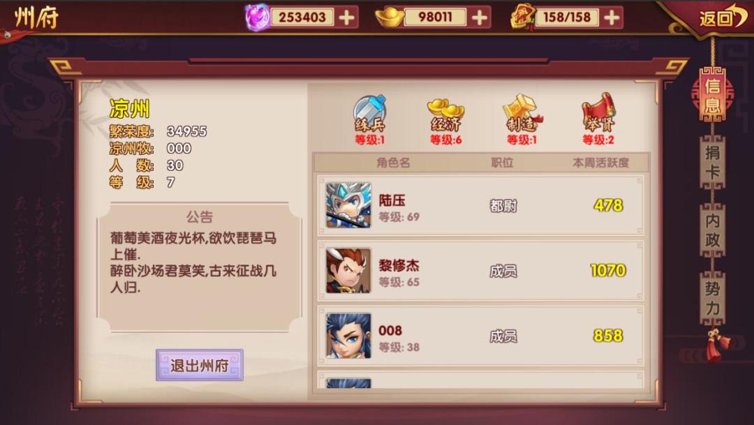 1、每周1早上5点-周四早上5点,州府内所有成员上报自己的武将供州府调用。可以增加州府繁荣度,也可以增加自己的活跃度。