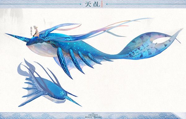 鲲的外形设定主要来源于鲸鱼,为了表现更多的海洋元素,主要以海蓝色作为重点配色,身体上则点缀彩色的鳞片和鱼鳍,并附着些许星座图案来表现更多的神话气息。