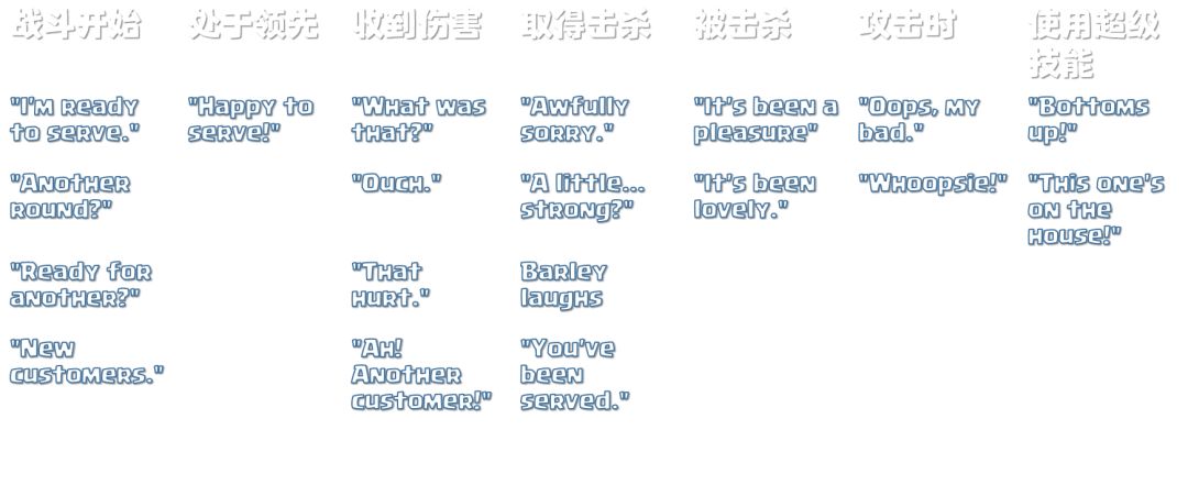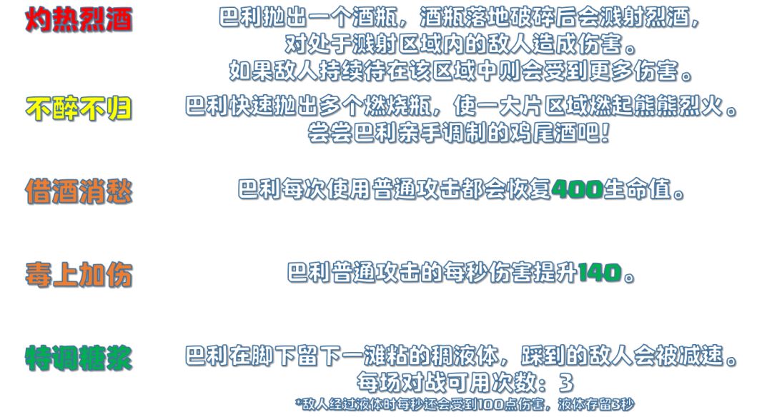 巴利抛出一个酒瓶,酒瓶落地破碎后会溅射烈酒,对处于溅射区域内的敌人造成伤害。如果敌人持续待在该区域中则会受到更多伤害。