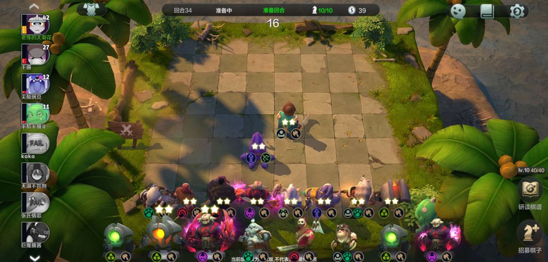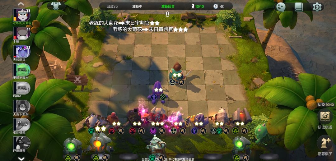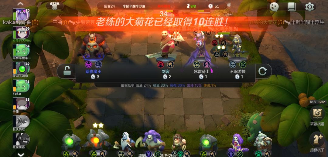 然后留钱上八级,然后给紫卡升升星,末日一定尽量升三,其他紫卡2星就好,海象、大鱼人、小小(一费战士,石头人)一个一个升三星,千万别太贪,同时存好几个只会导致一个也升不成三星,成型以后就是随便打,连胜赚钱美滋滋。