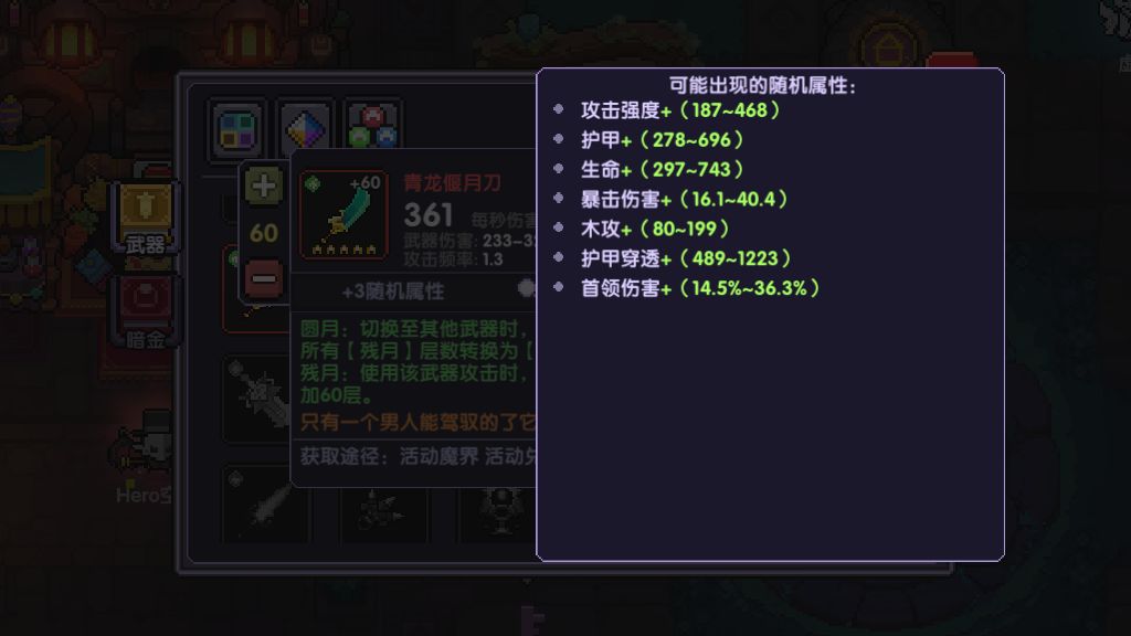 当然有条件的萌新可以买天狗号或者天狗车,脸好两个星期还是有希望做出龙刀的,值得一提的是,中秋时惯称月下无影剑为“小龙刀”足以证明其属性的突出,它近60爆伤是全游第二(塔格纳斯的低语72)。