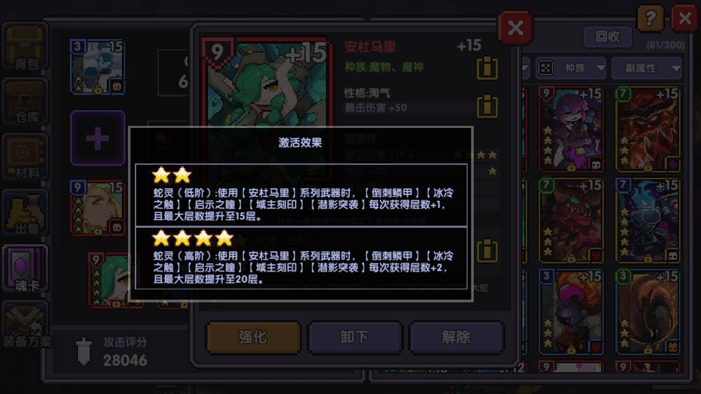 作为雷法的第一把四星,蛇拥有魔女武器中算是优秀的面板,前期可以带上暴击保证一定暴击率,条件允许的情况下最好能洗出橙穿甲,100前护甲对输出的阻碍就会大大减小。