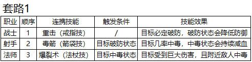 战士:技能和技能间是可以有连携的,知道吗!我现在带的是有重击技能的戒指!射手老弟你要带上毒箭技能的箭袋,法师老妹你换上有爆裂术的法杖,这样我们的套路就带好了!