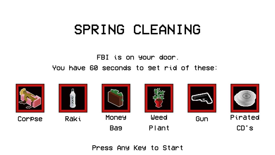 《Spring Cleaning》,FBI就在门口,你只有60秒去消除所有证据(游戏为Global Game Jam 2019参赛作品)