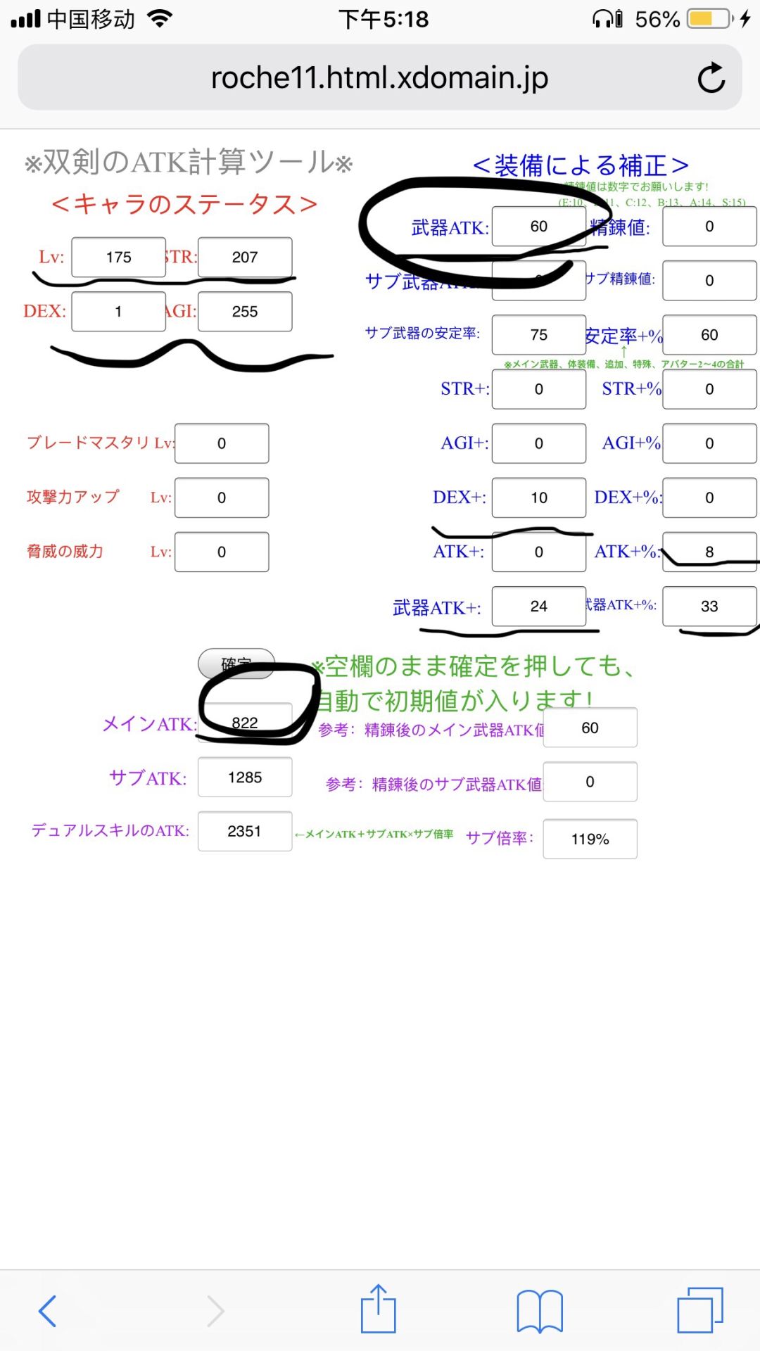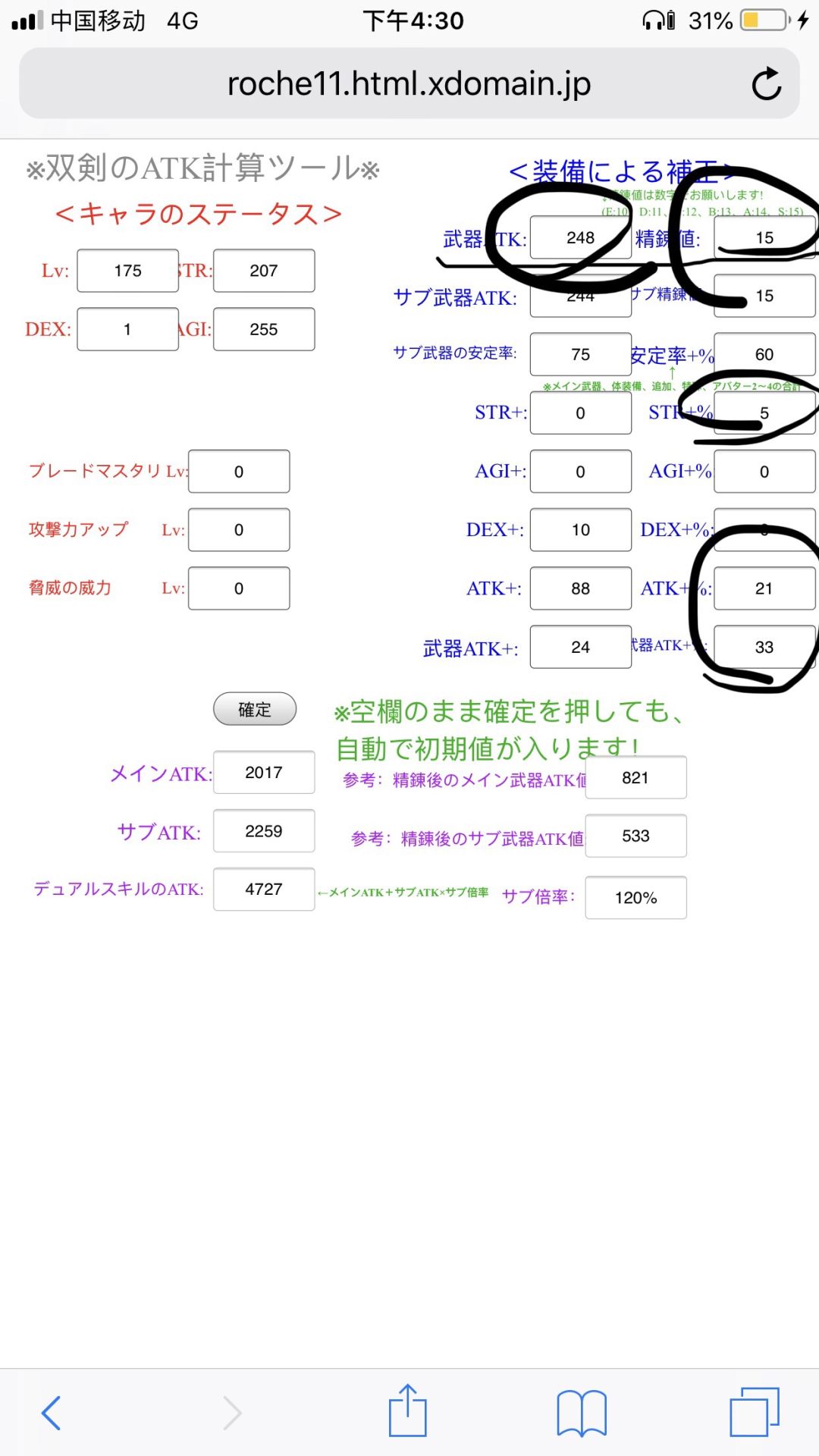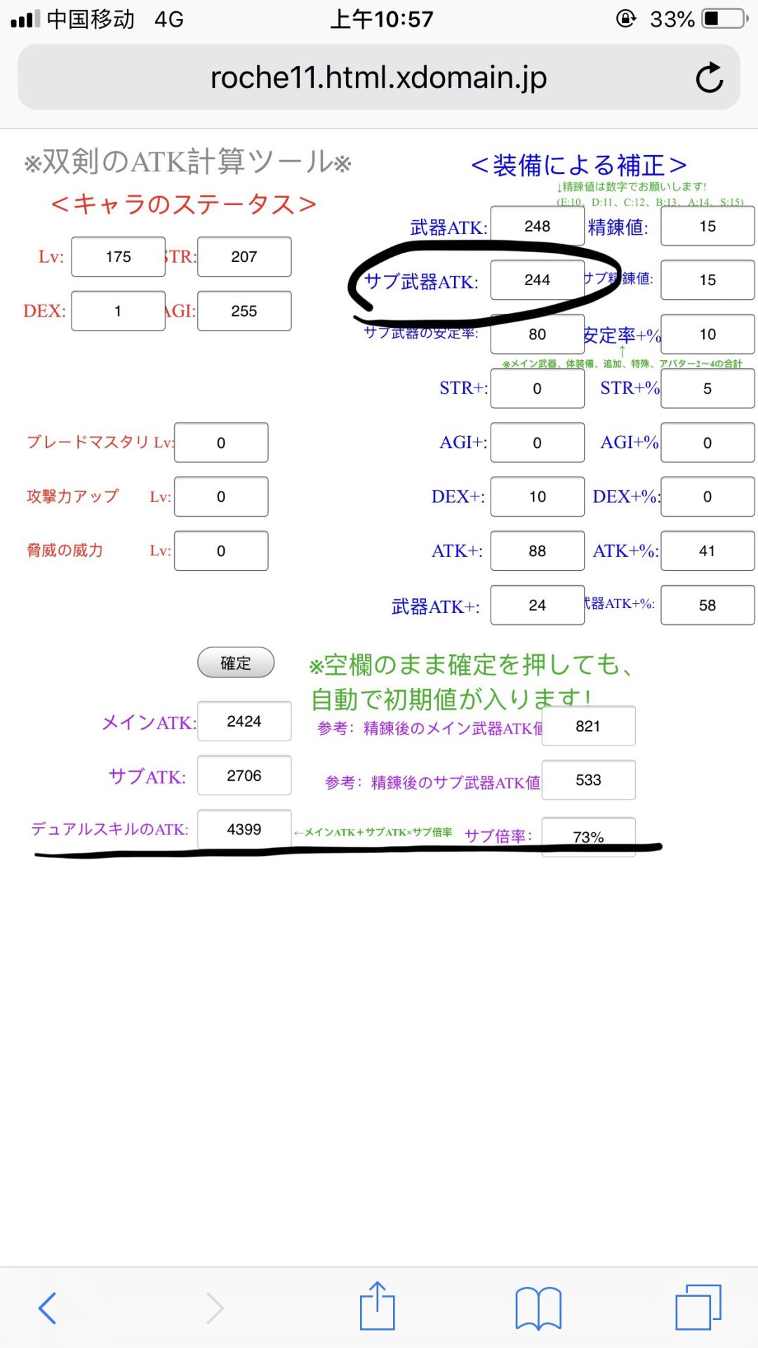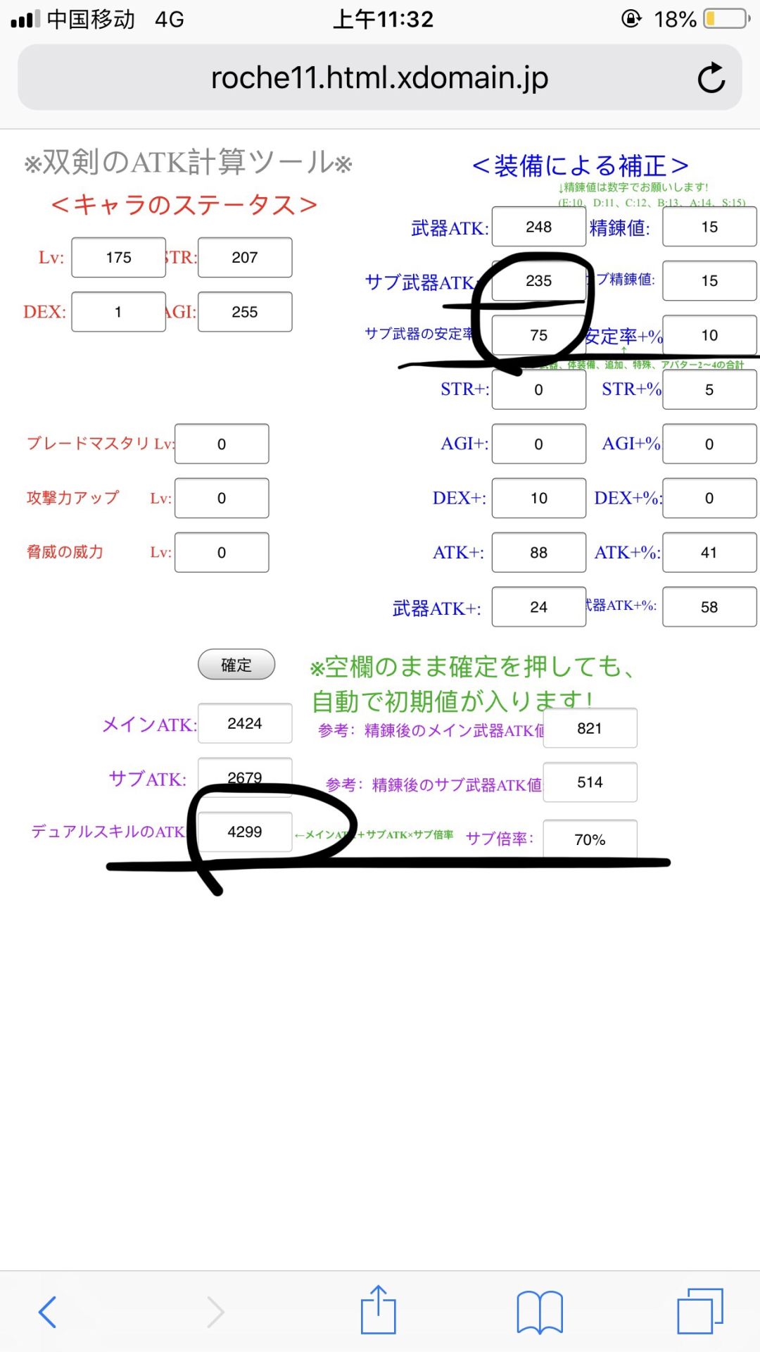 感谢风惋大佬提醒~这里重新考虑了一下,因为狂战不影响双剑的副手占比,所以在带入计算的时候装备稳定率一栏只带入10%(约克),这样计算完副手占比(副武器稳定/2(37.5皇女40飘飘剑)+装备稳定10+(STR*3+AGI*2)/40)应该在70左右,而带入60%的装备稳定网站算出来副手占比高达120%………(网站上写的主武器稳定率+装备稳定率+…误导我TAT)