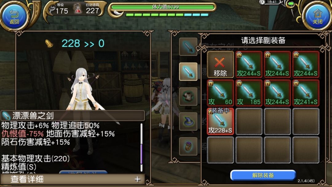 现在开始算副手提升,计算对比:自用的皇女副手(ATK244,稳定75%,精炼S),和飘飘剑(ATK228,稳定80%,精炼S)。因为要算的是实际打架时候的,所以自己BUFF技能的加成也要考虑进去,包括 狂战(配合约克最终稳定性为75+10-25=60%),