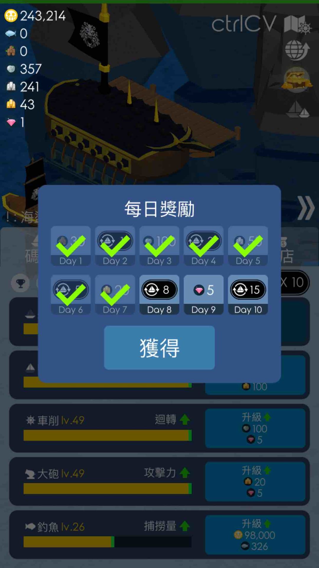 玩了8天,零零散散的,船还差点满级,捞箱子真的烦所以存钱买了货船,物资多余的都卖了才够,有货船就省事多了