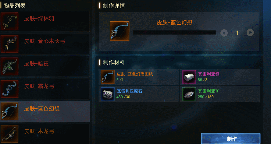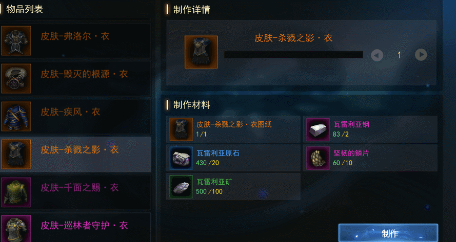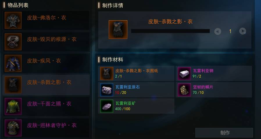 另外,在做任务的时候也会收集到一些制作材料,积累到一定数量后,就可以去制作皮肤了。每个皮肤所需要的制作材料种类和数量也都不一样。