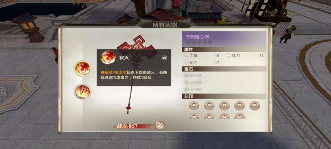 削弱对方提升自己的“万物随心·斧”,让你的胜算大大提升,武器技能“寂灭”让你在招式“强攻术”的状态是令攻击目标降低30%的攻击力,配合招式“如意斧”或“定军斧”可以一次削弱多个敌人的攻击。技能“激昂”可以使你在攻击受到招式“狮吼术”影响的敌人提高30%的伤害。