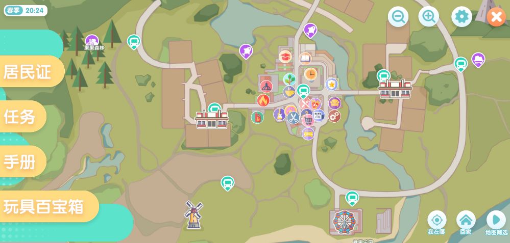 进入游戏后,点击屏幕右上方的菜单按钮,即可看见小镇的完整地图(看到图中的公交车标志了吗?那是真的可以传送的哦);