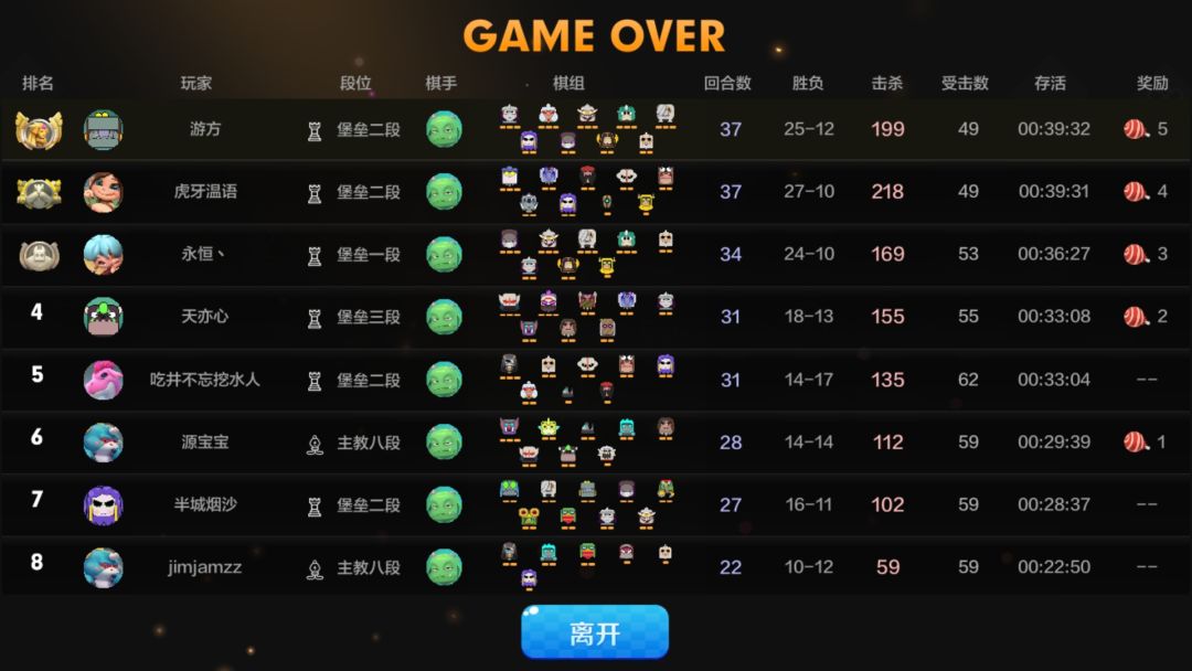 32回合,该抬的人都抬走了,第一名精英战,第二名德鲁伊(哈哈,谢谢老哥帮我抬人,一个人抬挺累的),第三名我。