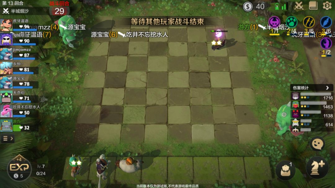 第13回合开始爆发升人口到7人口。此时阵容非常惨(我忘截图阵容了……大概记得,手打吧),2*猎魔人,1*逐风游侠,1*幽影刺客,2*刺魂者,1*坏女人,2*小鹿,1*海象拳王。
