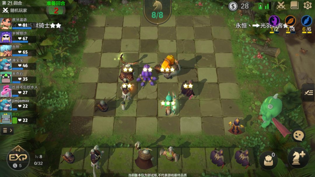 21回合来了光羽刺客果断升8凑齐6光羽,阵容比较一般,不过德鲁伊的强势期是20-35回合,假如35回合还没有取得胜利那就请做好死的准备,绝对不要想和别人打后期,除非你除了德鲁伊一堆三星。