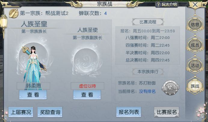 所有宗族都可以报名参加,报名时间为周一00:00到周五23:59;截止报名结束时,战斗力排名前十六的宗族有资格参加宗族战!