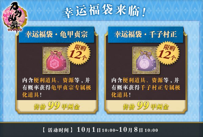 【活动详情】本次万屋上架龟甲贞宗、千子村正两位刀剑男士的幸运福袋。开启专属极化道具幸运福袋,有机会获得资源、道具、刀装和刀剑男士专属极化道具。幸运福袋售价99甲州金/个,每种限购12个,开启全部12个福袋必得一套对应刀剑男士的专属极化道具。想送他们去修行的审神者请千万不要错过机会。