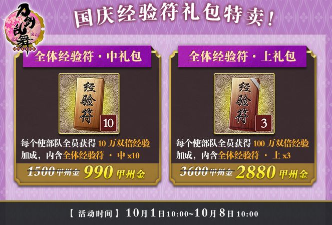 同时,为满足不同审神者的战力育成需求,特别追加给单个刀剑男士使用的经验符·中礼包,内含内含经验符·中*12,原价360甲州金,优惠售价280甲州金,每日限购3次。