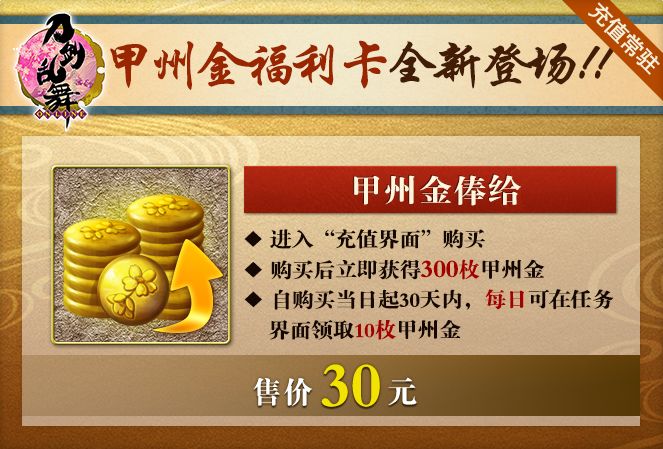 【活动详情】国服原创甲州金福利道具——“甲州金俸给”全新登场,并常驻“充值界面”!购买“甲州金俸给”后,能够立即获得300枚甲州金;自购买当日起30天内,每日可在任务界面领取10枚甲州金。“甲州金俸给”售价为30元,购买一次最多累计可获取600枚甲州金。“甲州金俸给”为独立现金购商品,不计入累计充值,不可激活军备扩充卡。