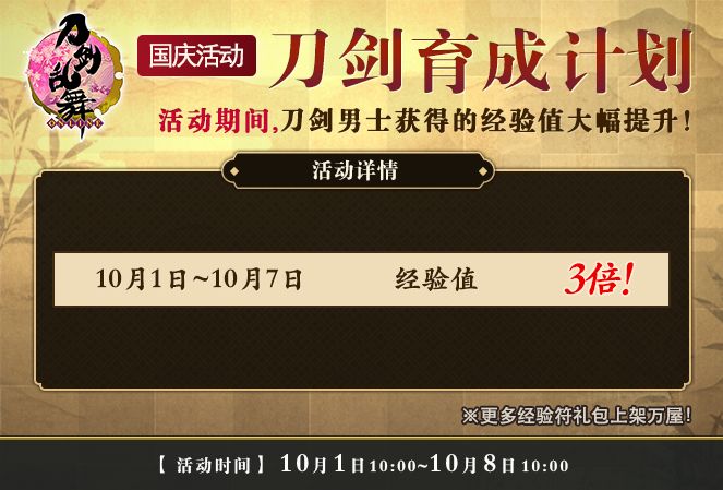 【活动详情】活动期间,刀剑男士获得的经验值大幅提升至3倍!请审神者不要错过育成刀剑男士的时机。同时,多种经验符礼包上架万屋特卖,搭配使用能够助力刀剑男士更快成长!