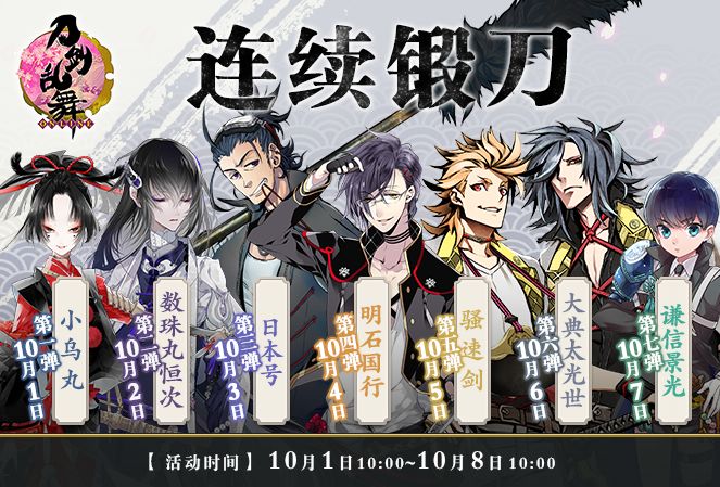 10月1日10:00~10月2日10:00,审神者有机会通过锻刀功能锻出【太刀·小乌丸】。