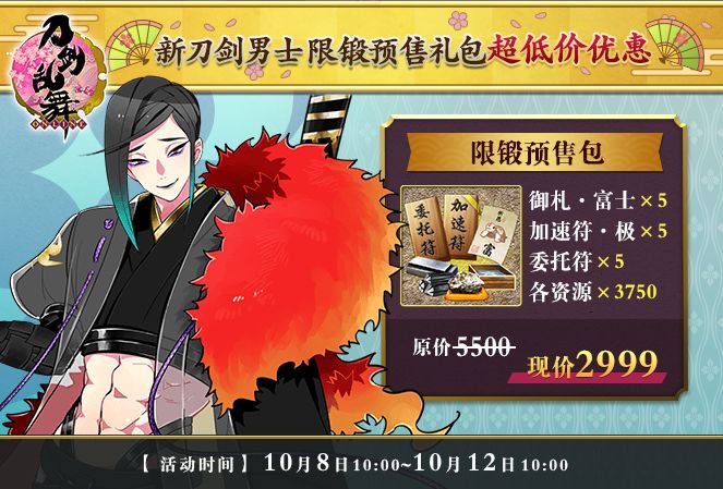 【活动详情】新刀剑男士——静形薙刀限时锻刀预售礼包内含:御札·富士*5、加速符·极*5、委托符*5、各资源*3750。礼包原价为5500甲州金,现以特价2999甲州金售卖,每日特惠限购3次。