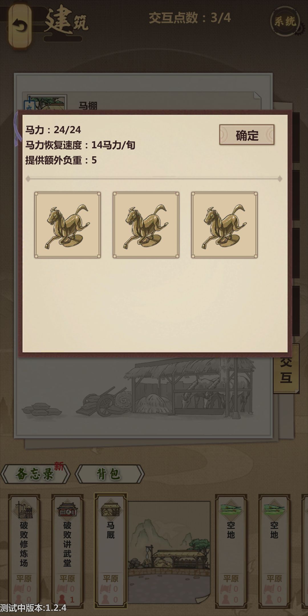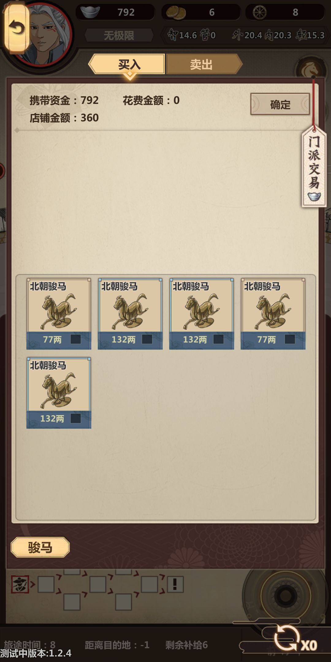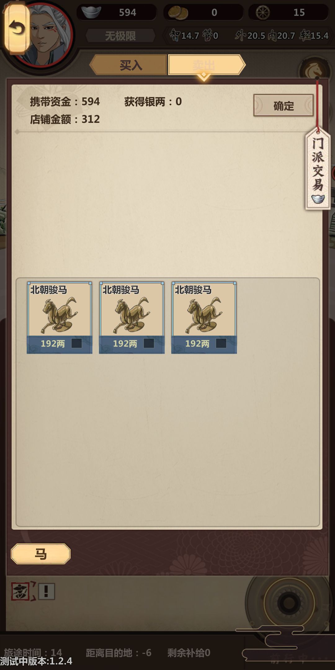 这个档我还要玩,所以留下了三匹马,等回去把我自己的马换掉,想换马需要行侠结束之后才可以更换。所以就成这样了。要想这里的钱空掉。就少卖一个100的,多卖两个192的。这里的店铺金额也能成很低的2位数。
