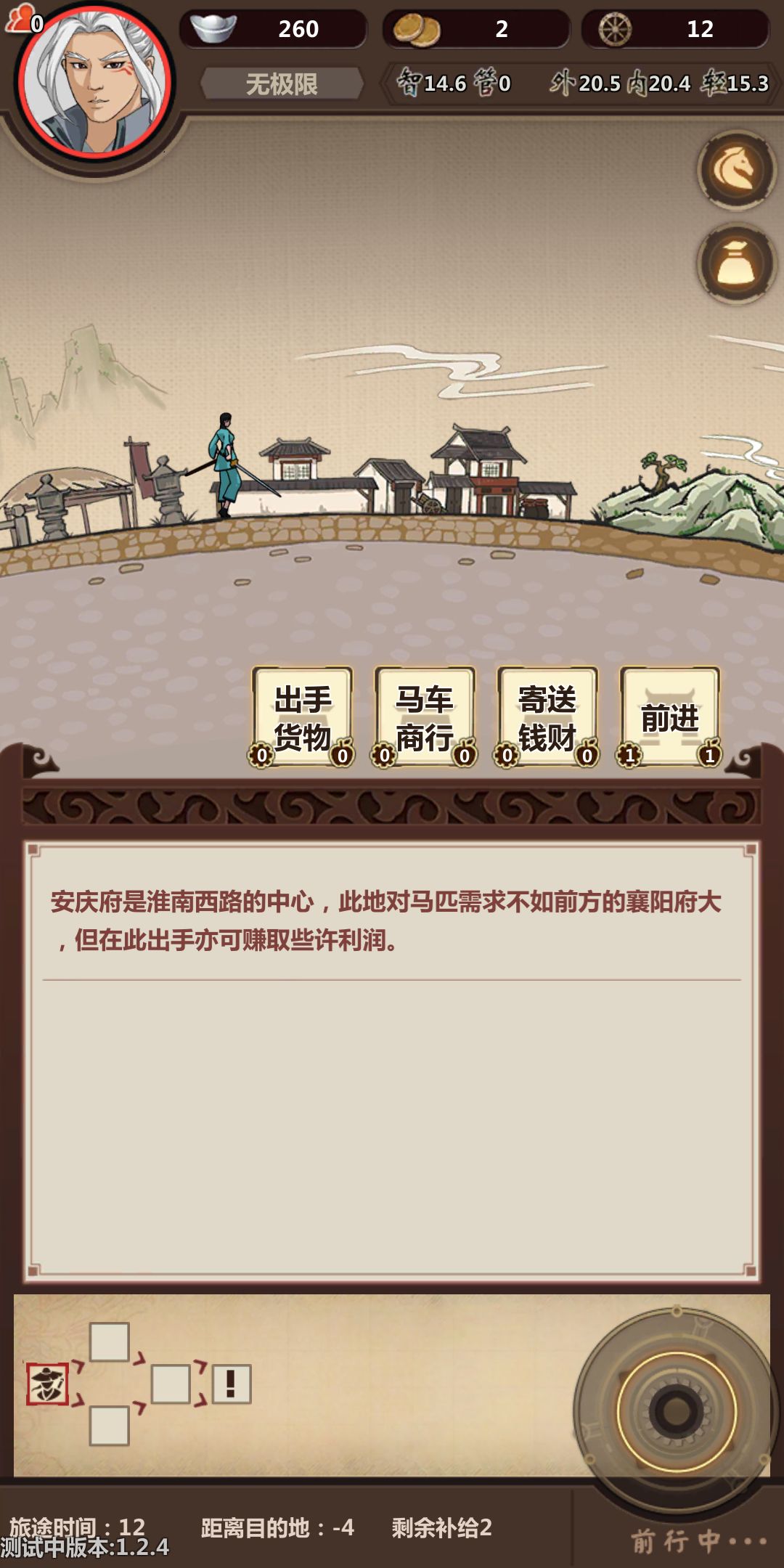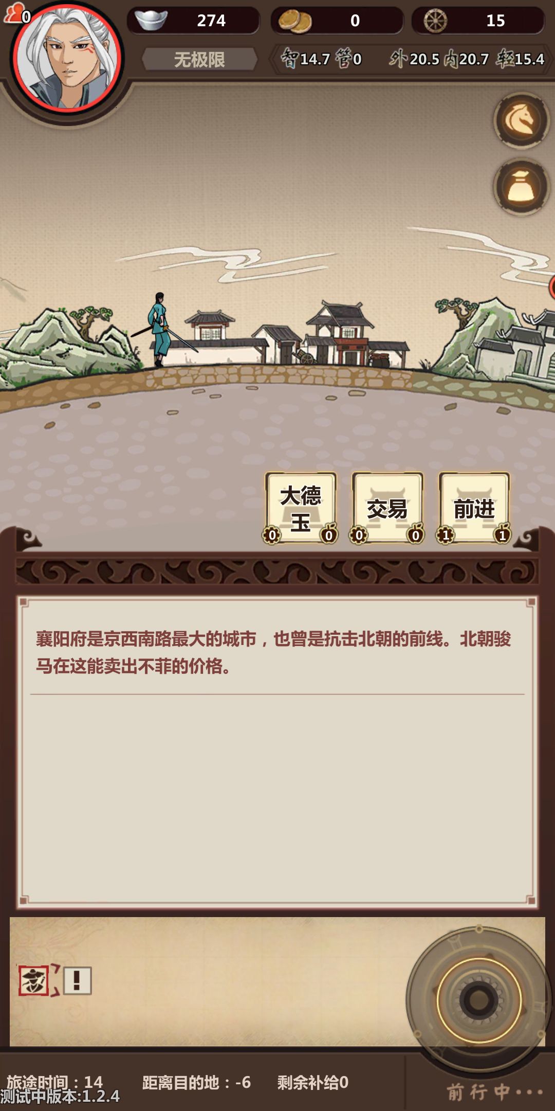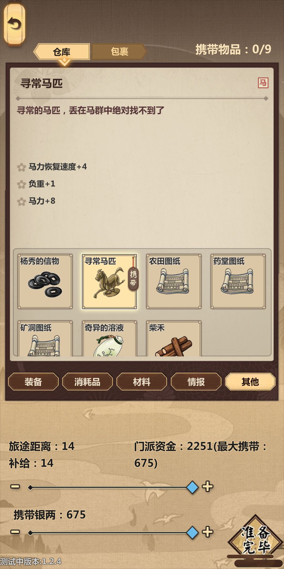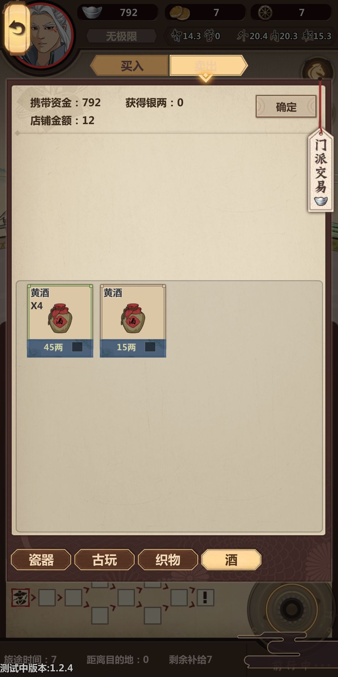然后就开始了!!!带上我们的压仓(酒和马),开始跑路,酒压仓比较稳,用不了可以送好感度。在这里提醒一下,第一次跑商是为了后边做铺垫,第一次行侠商人的马和材料要适当的买点,黑市搬空,下旬不出现黑市。