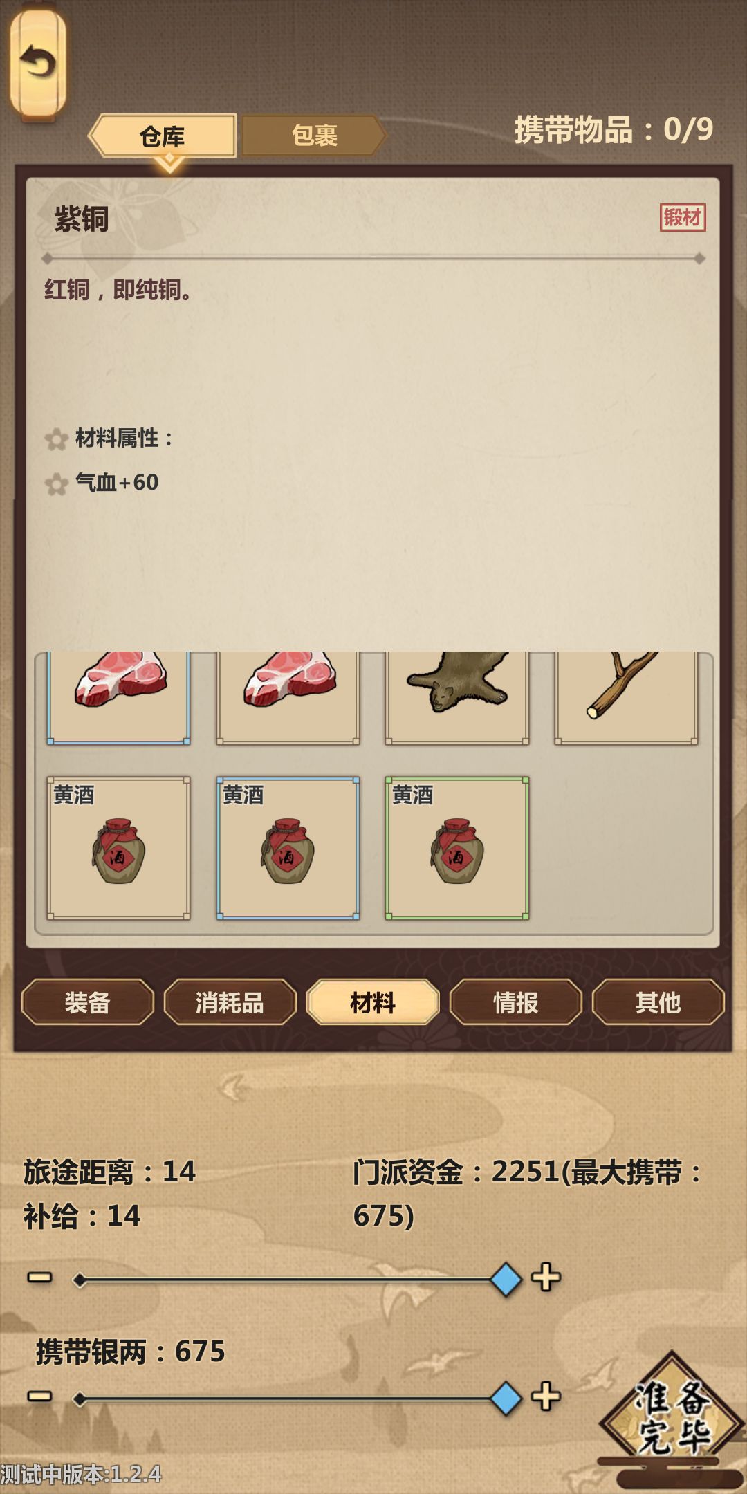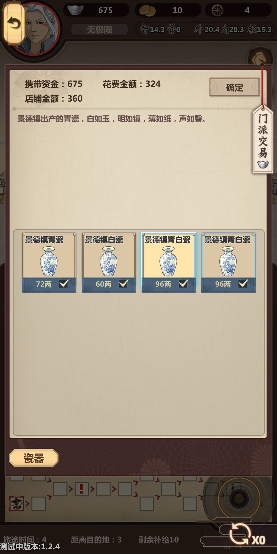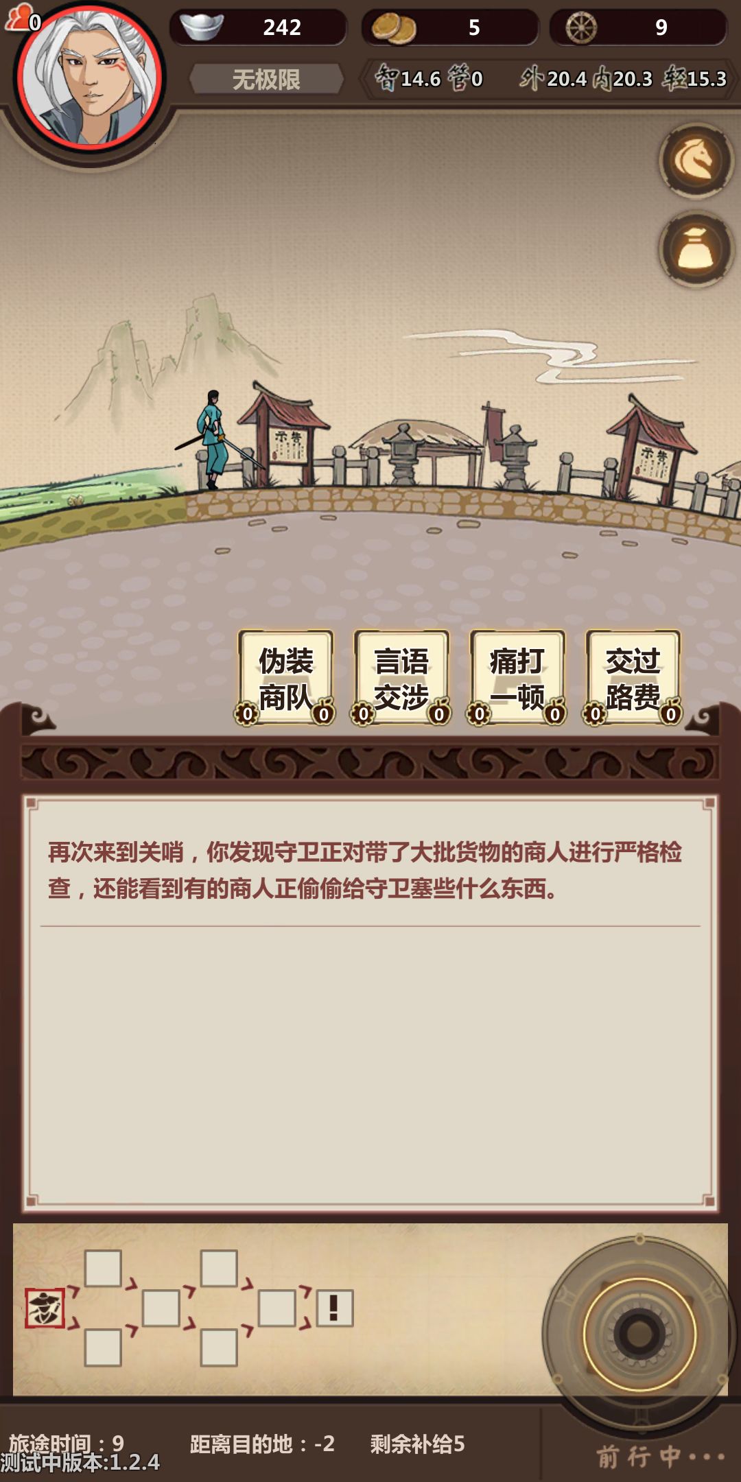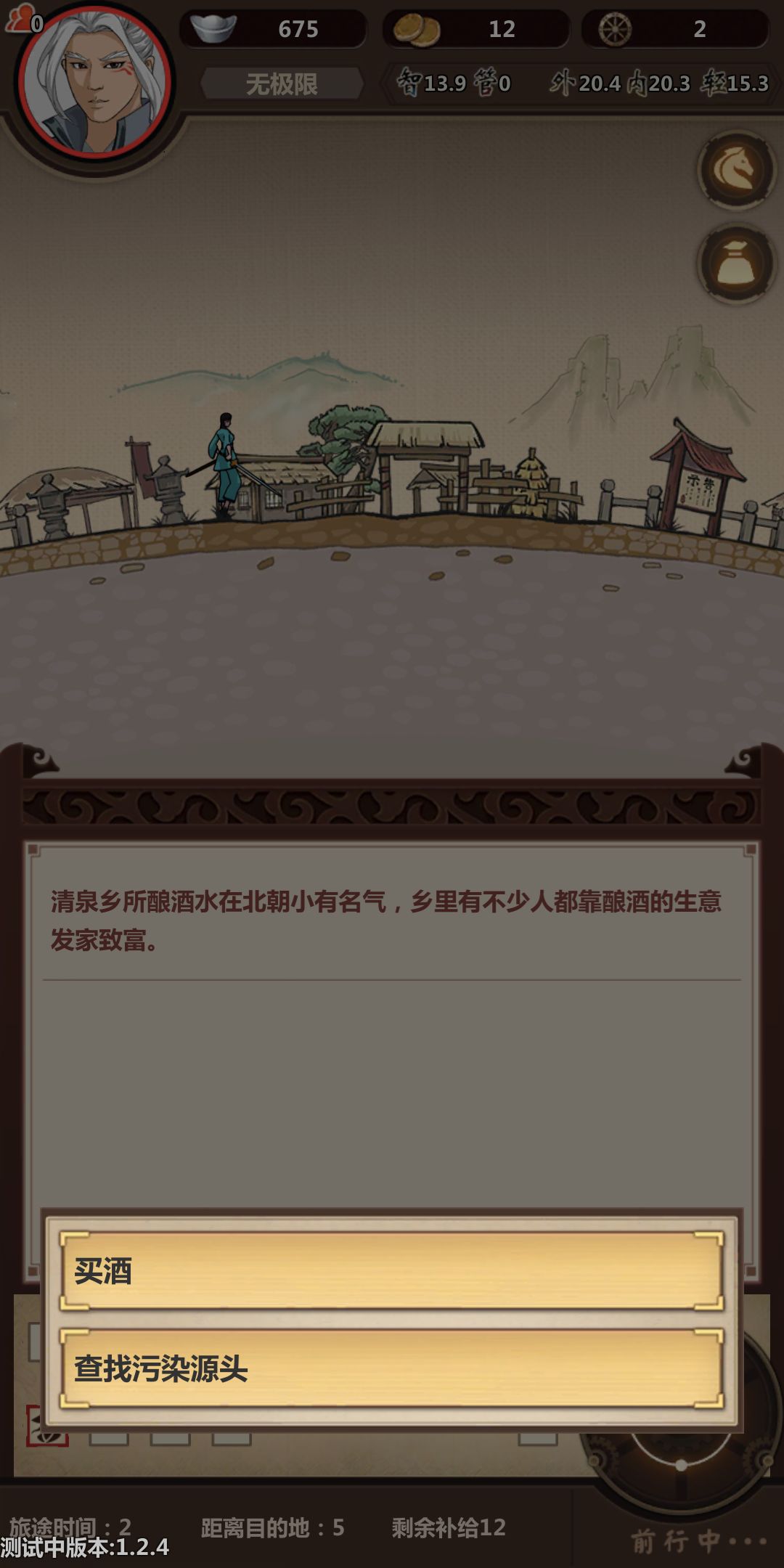 然后就开始了!!!带上我们的压仓(酒和马),开始跑路,酒压仓比较稳,用不了可以送好感度。在这里提醒一下,第一次跑商是为了后边做铺垫,第一次行侠商人的马和材料要适当的买点,黑市搬空,下旬不出现黑市。