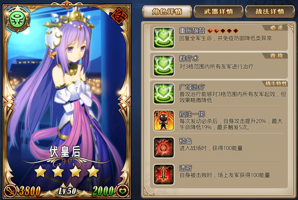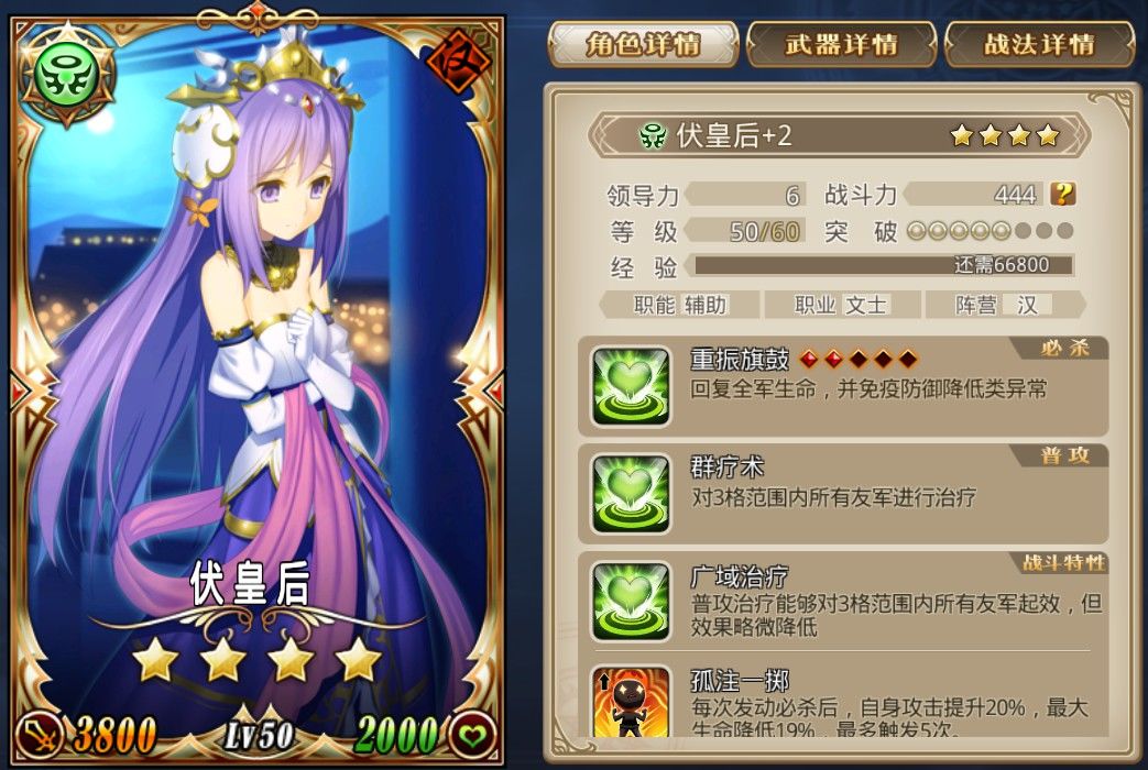 活动内容:《伏皇后的挑战》活动关卡刷新并重新开放,通过活动可获得特别4星辅助角色-伏皇后。本次活动最高档武将卡奖励仅需3wpt哦~