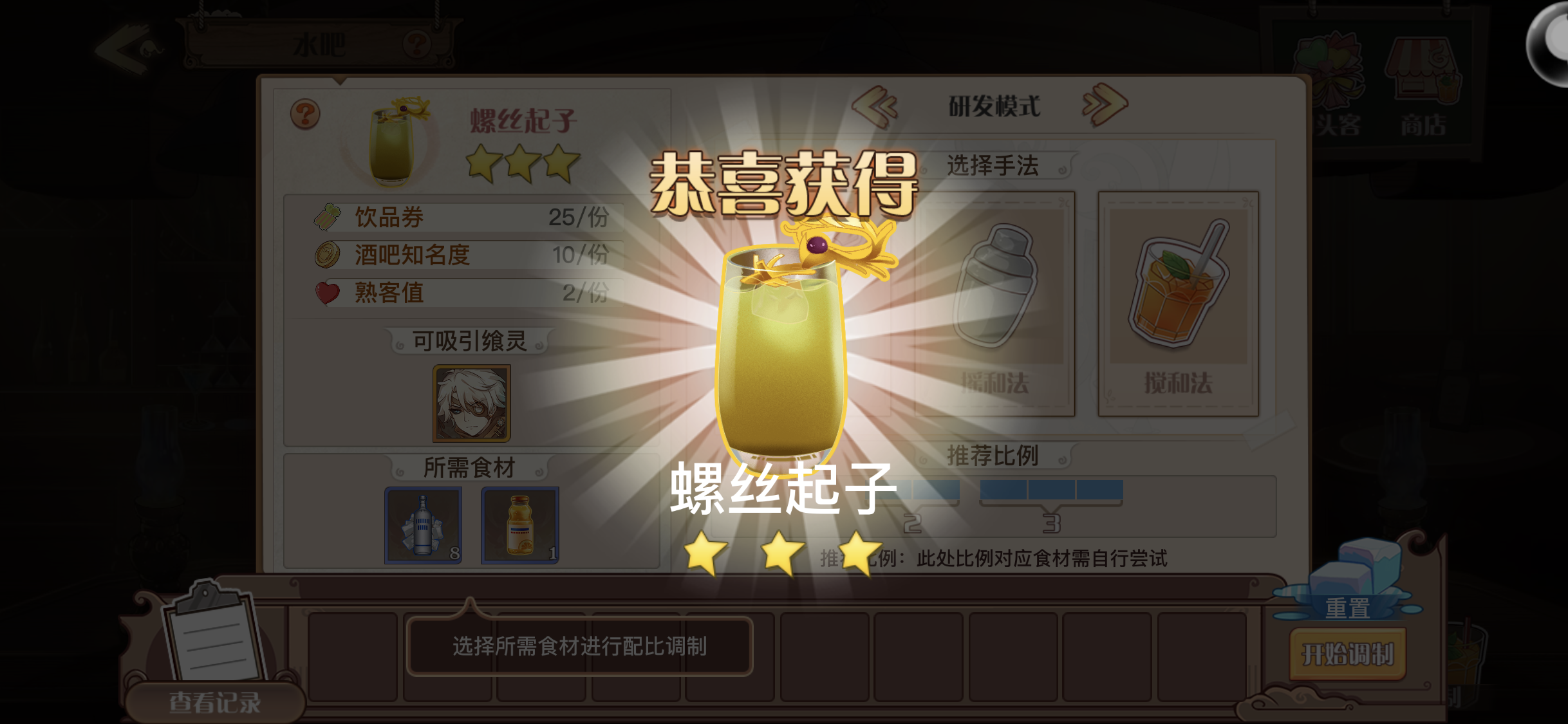 2. 在调制界面,调制5杯饮品,根据可吸引飨灵和今日访客,优先以下配方(可重复调制)
