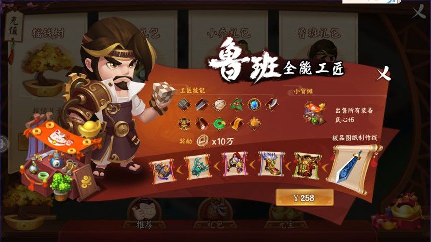 接下来说一下打造方面的,打造这一块还是很吃工匠的,工匠多了你也吃不消,所以前期工匠的选择也很重要,鲁班工匠是万能的存在,一个全能工匠,可以省下很多开工匠位的铜币和元宝,虽然鲁班技能等级不高并且不精通,但是和开启工匠槽所需的铜币或元宝相比,性价比可谓是极高的,重点是送的小货摊,万能的存在。